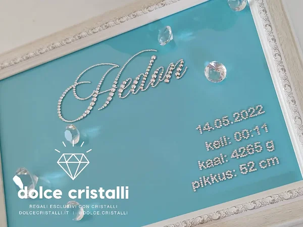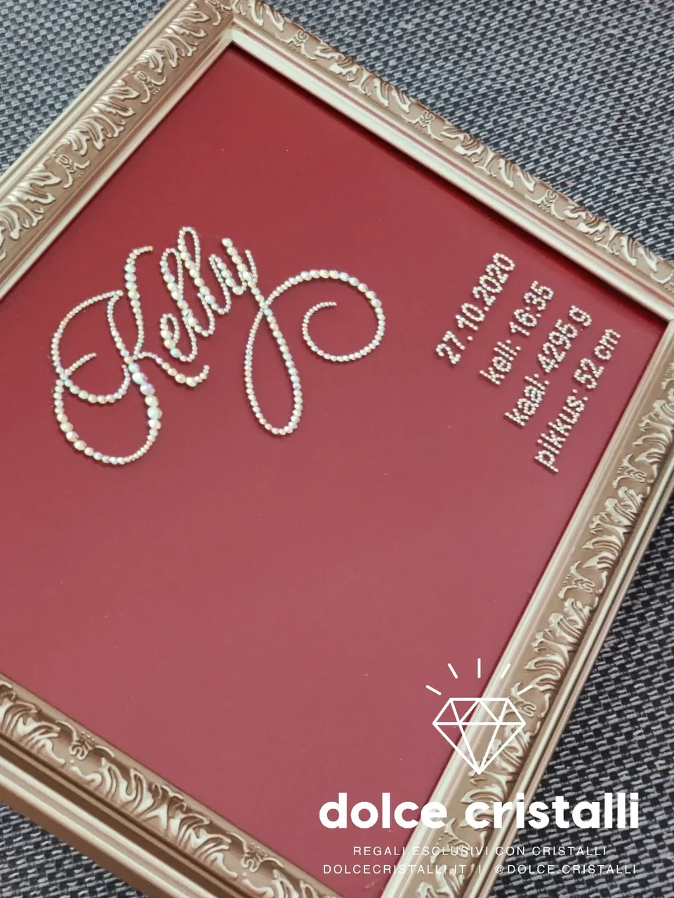 Cornici uniche decorate con cristalli, create per custodire i momenti più importanti della vita — la nascita di un bambino, il matrimonio o un messaggio bello e ispirante.